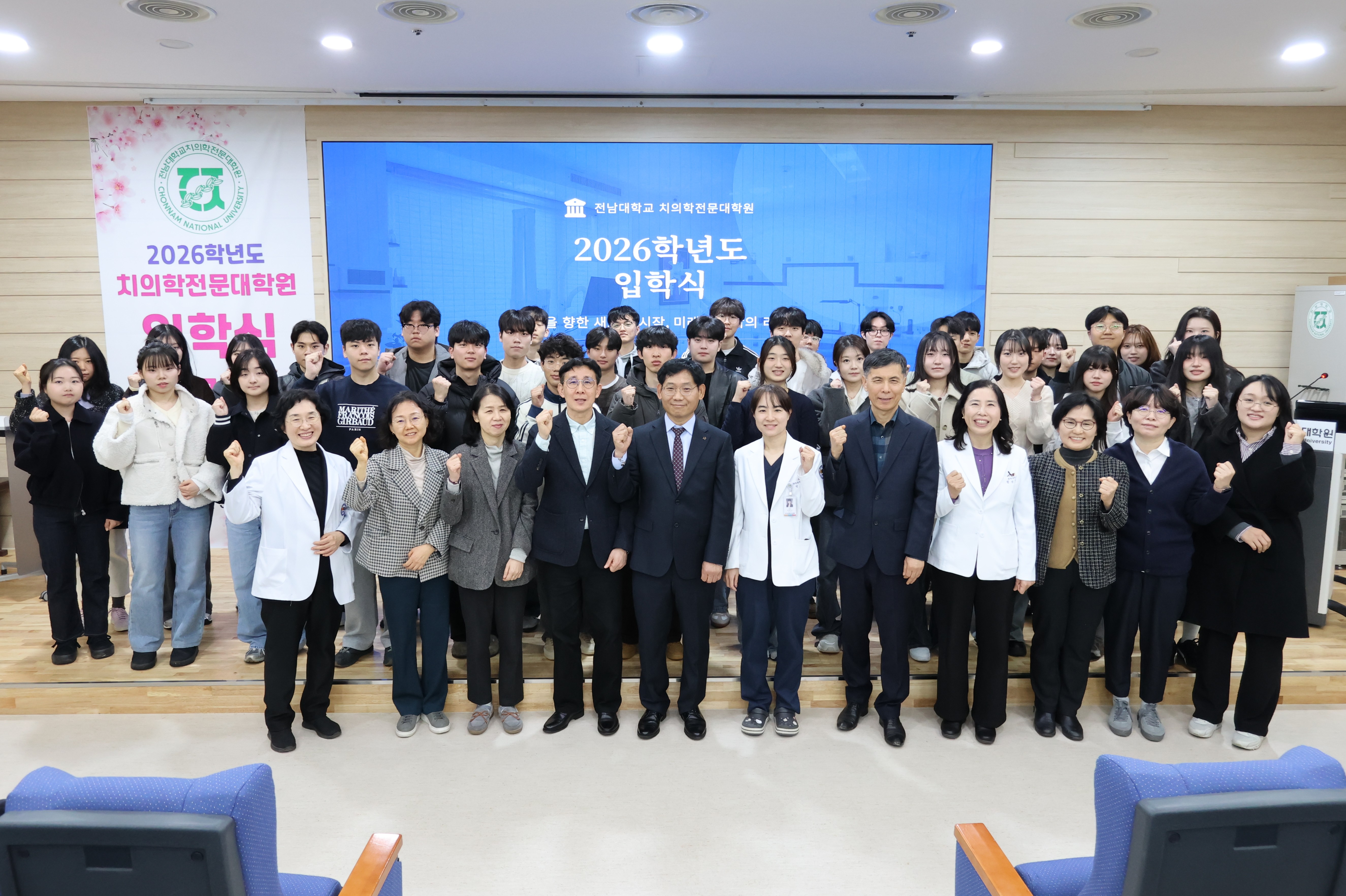 전남대학교 치의학전문대학원(원장 고정태)은 2026년 3월 3일(화) 임상교육관 5층 평강홀에서 학석사통합과정 입학식을 개최하고 신입생 32명의 입학을 축하했다. 이날 행사는 고정태 원장의 환영사를 시작으로 △신입생 호명 △재학생 대표 환영 인사 △입학 허가 선언 △신입생 대표 선서 순으로 진행됐다.